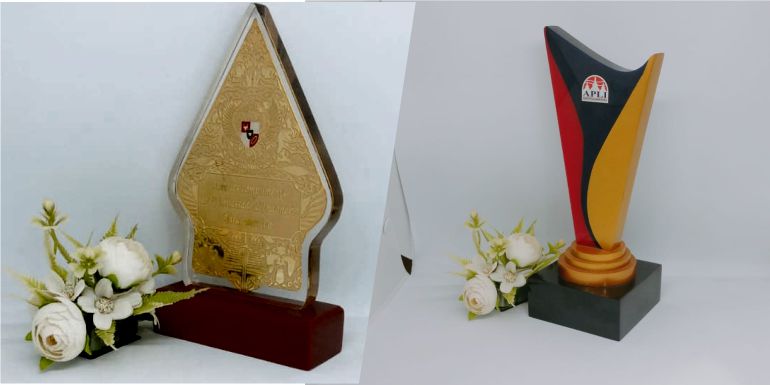 Plakat Kayu:Plakat kayu menawarkan kesan alami dan klasik. Bahan kayu dapat diukir dengan berbagai desain dan tulisan, menjadikannya pilihan populer untuk penghargaan dengan nuansa tradisional.